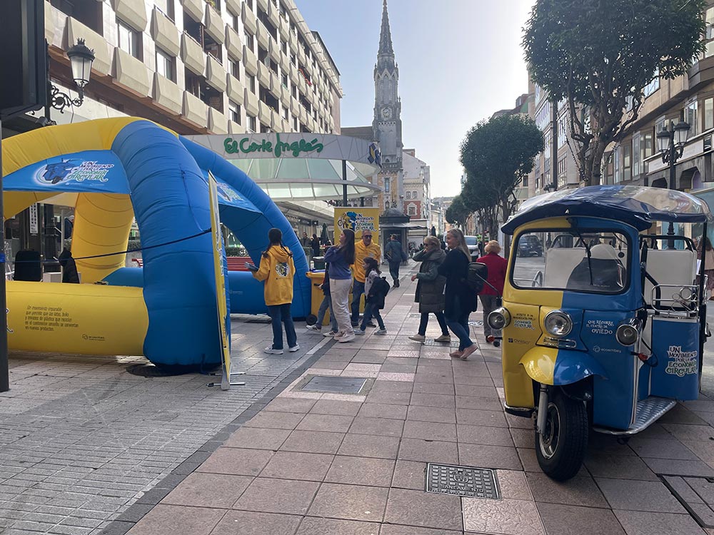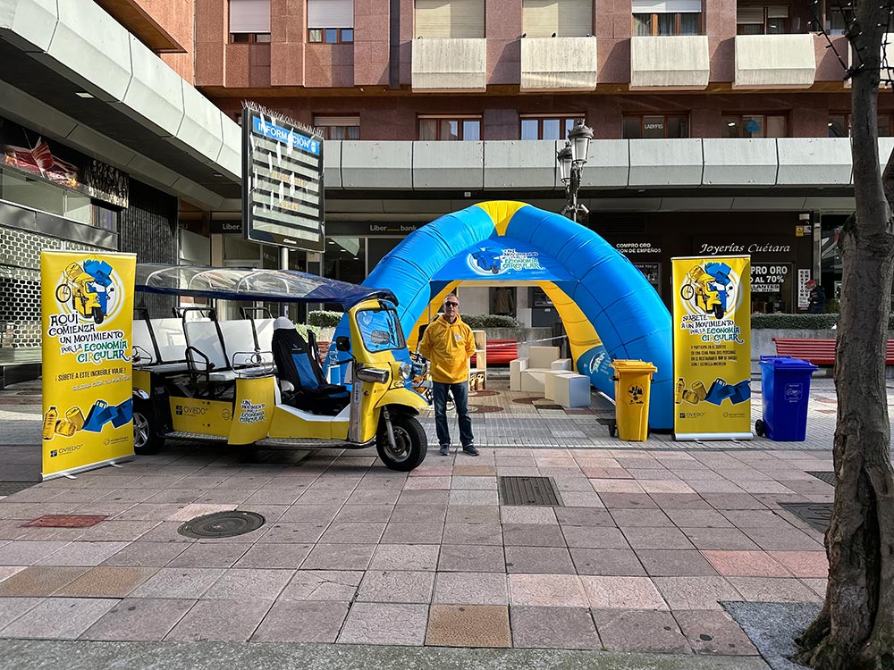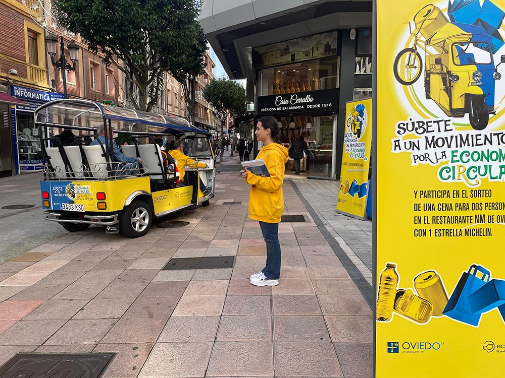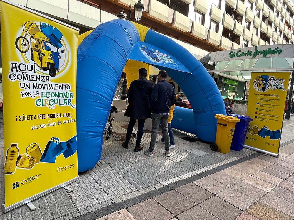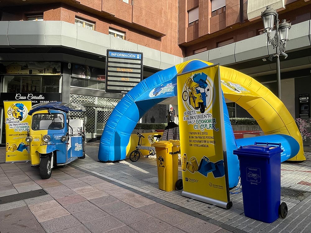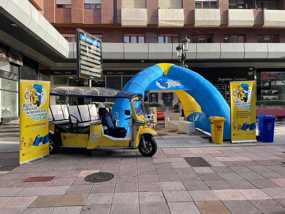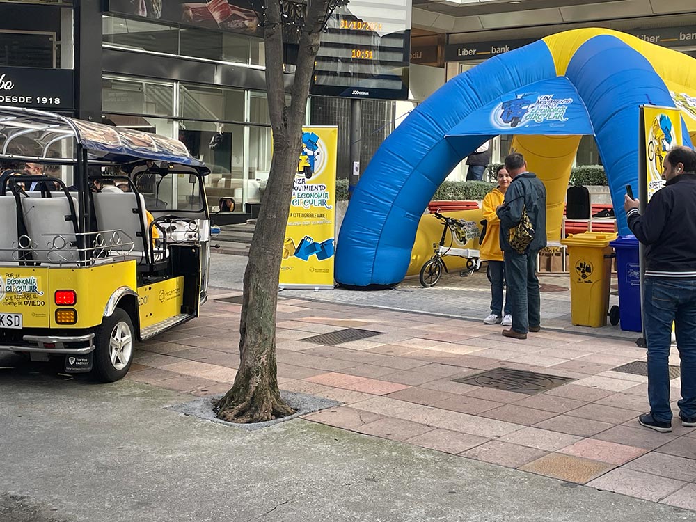 Para iniciar este increíble viaje tan sólo tenían que subirse a nuestro vehículo tuktuk 100% eléctrico que les llevaría por un recorrido circular por el centro de Oviedo. Durante el viaje les invitamos a una bebida (lata de refresco o botella agua) y algo para picar (bote aceitunas, galletas saladas o cookies). El viaje circular continuó hasta llegar a su punto final en donde había un contenedor amarillo y azul junto a una carpa. En estos contenedores podían echar los envases de los productos que disfrutaron durante el viaje. Tras echar los envases en los contenedores, pudieron entrar en la carpa y disfrutar de una exposición de productos en los que se pueden llegar a transformar esos envases que han echado en los contenedores.