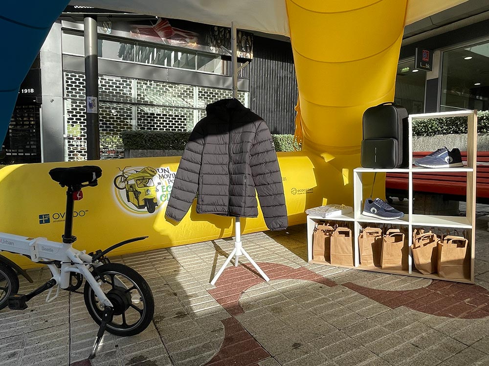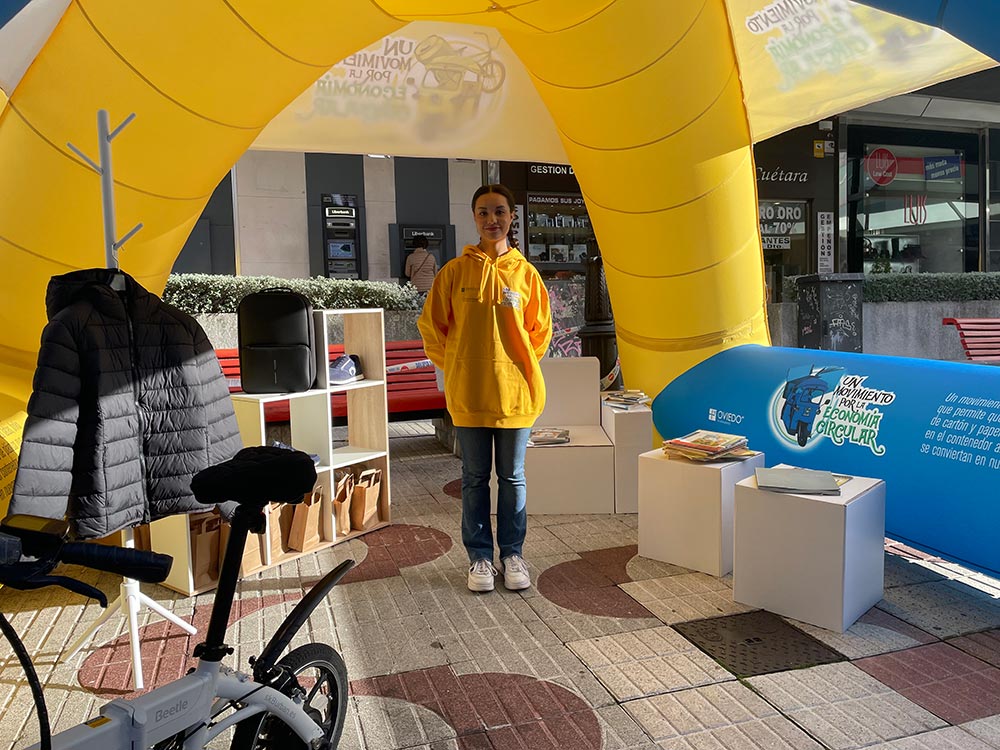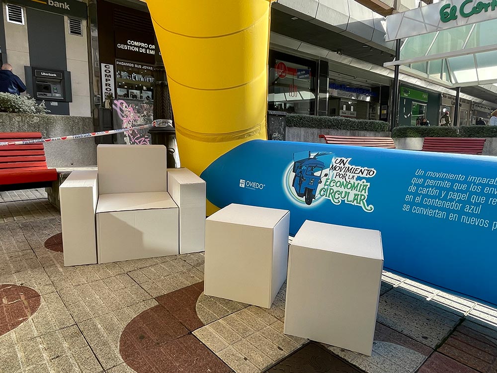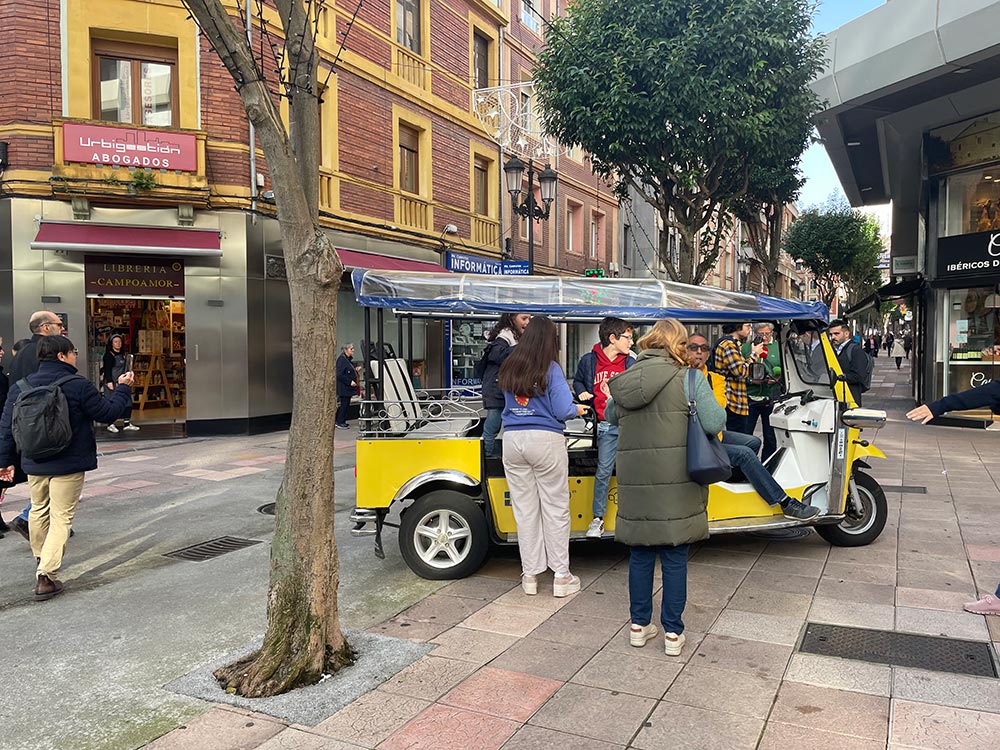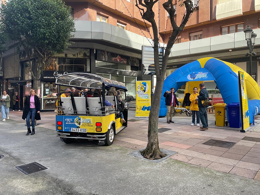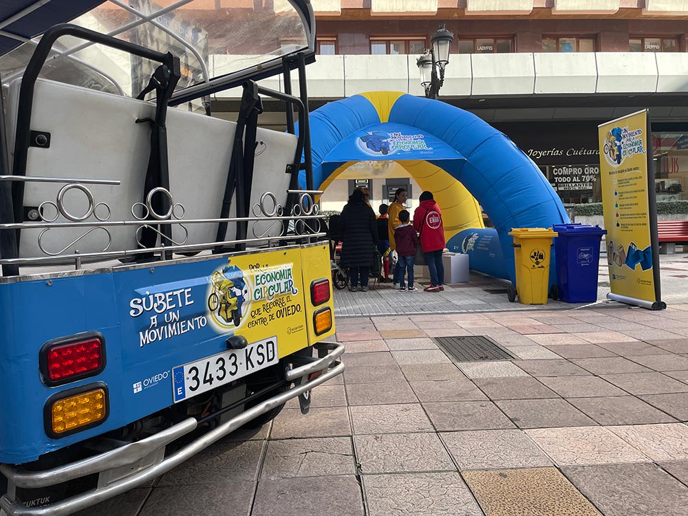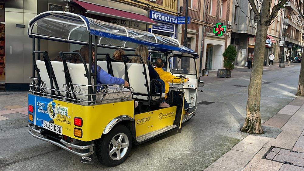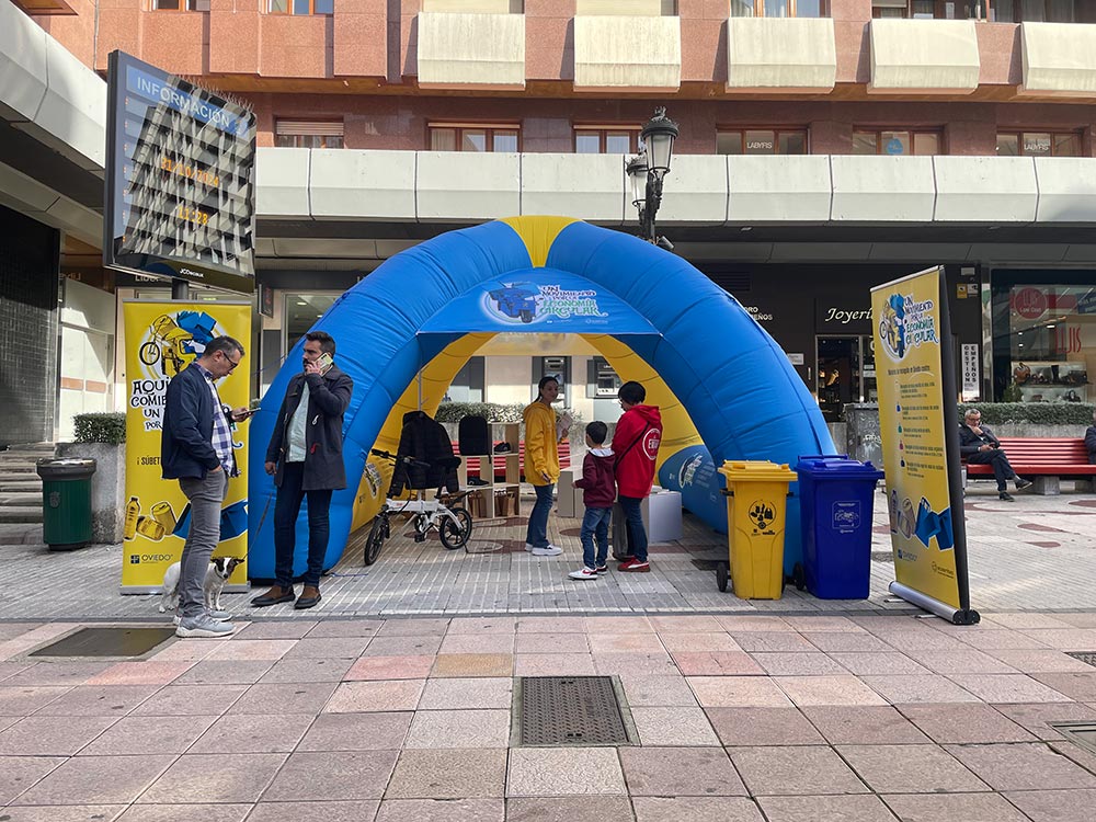 Para iniciar este increíble viaje tan sólo tenían que subirse a nuestro vehículo tuktuk 100% eléctrico que les llevaría por un recorrido circular por el centro de Oviedo. Durante el viaje les invitamos a una bebida (lata de refresco o botella agua) y algo para picar (bote aceitunas, galletas saladas o cookies). El viaje circular continuó hasta llegar a su punto final en donde había un contenedor amarillo y azul junto a una carpa. En estos contenedores podían echar los envases de los productos que disfrutaron durante el viaje. Tras echar los envases en los contenedores, pudieron entrar en la carpa y disfrutar de una exposición de productos en los que se pueden llegar a transformar esos envases que han echado en los contenedores.